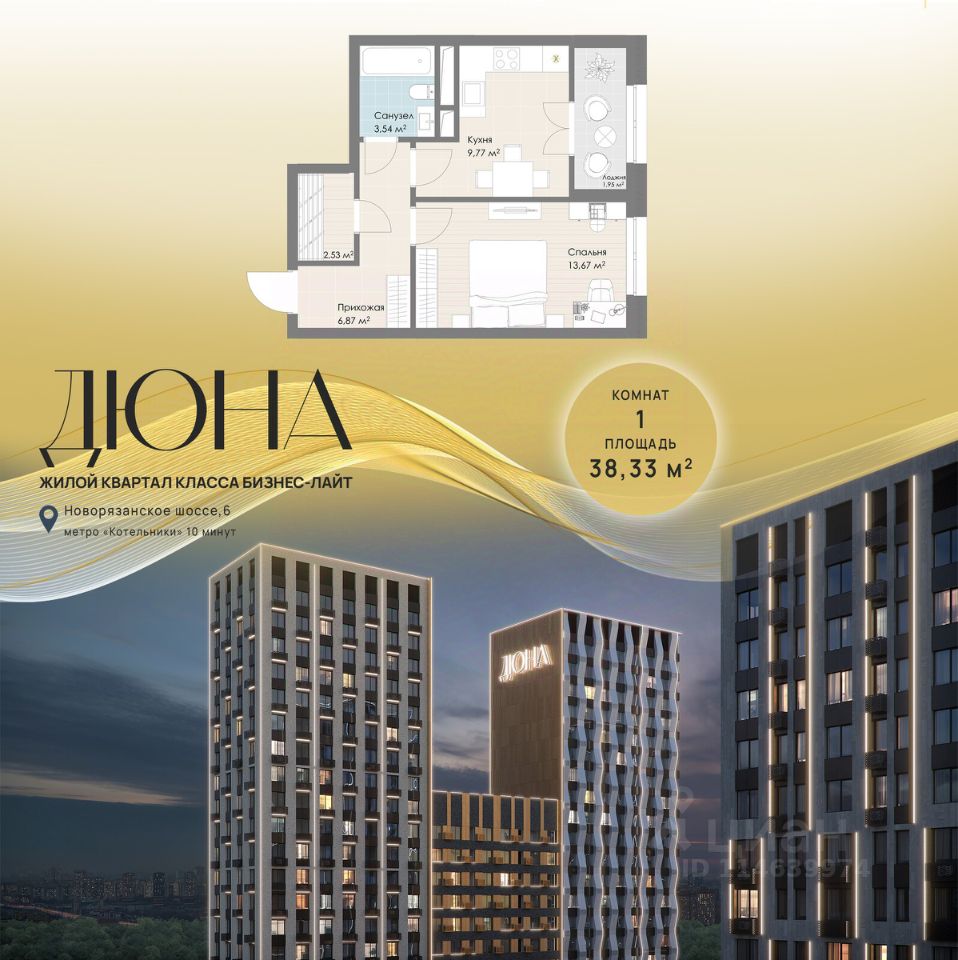 Современный жилой квартал бизнес-класса "Дюна" расположен в 10 минутах ходьбы от станции метро "Котельники" (1,2 км) на пересечении Новорязанского и Дзержинского шоссе. Квартал находится в районе с развитой инфраструктурой: в непосредственной близости расположены школы, детские сады, поликлиники, а также гипермаркеты и торговые комплексы, такие как "Metro", "Глобус", "Лемана Про" (Леруа Мерлен), "МЕГА Белая Дача", "Outlet Village Белая Дача" и другие. В шаговой доступности находятся физкультурно-оздоровительный комплекс с бассейном и теннисными кортами, а также благоустроенный лесопарк "Кузьминки" площадью 1189 га. Неподалёку расположены пляжи Дзержинских карьеров с экстрим-парком и горнолыжными трассами, Томилинский лесопарк с лыжной базой и Жулебинский лесопарк. Застройщик реализует современную урбанистическую концепцию "Город в городе", которая подразумевает наличие собственной полноценной инфраструктуры на территории жилого комплекса, включая школу, детские сады, торговую галерею, бизнес-центр, пункт полиции и медицинский центр. Общая площадь застройки составляет 12,2 га. Квартиры представлены в диапазоне планировок от студий до четырёхкомнатных, в обычном и евроформате. На этажах расположено от 3 до 4 бесшумных скоростных лифтов при количестве квартир от 4 до 7 на этаже. Квартиры сдаются с предчистовой отделкой (white box). Здания переменной этажности строятся по технологии монолит-кирпич, а фасады выполнены с использованием инновационной системы вентилируемого комбинированного фасада.Комфорт на внутренней территории обеспечивается за счёт принципа "двор без машин", системы доступа по карте и круглосуточного видеонаблюдения. Приобрести квартиру можно с использованием материнского капитала, беспроцентной рассрочки или ипотечных программ. При 100% оплате предусмотрены индивидуальные условия.
