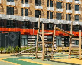 В корпусах спроектированы просторные подъезды с высокими потолками, витражным остеклением, современным дизайном и двумя входами: со двора и улицы. Входы расположены на уровне земли, без ступеней и пандусов. В больших зелёных дворах без автомобилей оборудуются места для отдыха, детские и спортивные площадки.