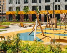 В корпусах спроектированы просторные подъезды с высокими потолками, витражным остеклением, современным дизайном и двумя входами: со двора и улицы. Входы расположены на уровне земли, без ступеней и пандусов. В больших зелёных дворах без автомобилей оборудуются места для отдыха, детские и спортивные площадки.