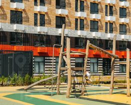 В корпусах спроектированы просторные подъезды с высокими потолками, витражным остеклением, современным дизайном и двумя входами: со двора и улицы. Входы расположены на уровне земли, без ступеней и пандусов. В больших зелёных дворах без автомобилей оборудуются места для отдыха, детские и спортивные площадки.