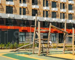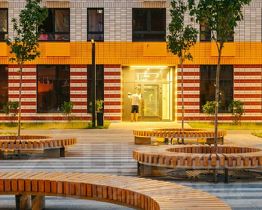 В корпусах спроектированы просторные подъезды с высокими потолками, витражным остеклением, современным дизайном и двумя входами: со двора и улицы. Входы расположены на уровне земли, без ступеней и пандусов. В больших зелёных дворах без автомобилей оборудуются места для отдыха, детские и спортивные площадки.