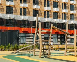 В корпусах спроектированы просторные подъезды с высокими потолками, витражным остеклением, современным дизайном и двумя входами: со двора и улицы. Входы расположены на уровне земли, без ступеней и пандусов. В больших зелёных дворах без автомобилей оборудуются места для отдыха, детские и спортивные площадки.
