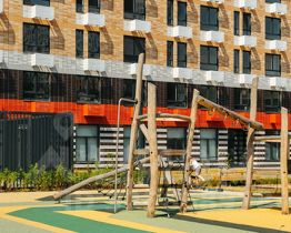 В корпусах спроектированы просторные подъезды с высокими потолками, витражным остеклением, современным дизайном и двумя входами: со двора и улицы. Входы расположены на уровне земли, без ступеней и пандусов. В больших зелёных дворах без автомобилей оборудуются места для отдыха, детские и спортивные площадки.
