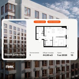 Продаётся 1-комн. квартира площадью 44,8 кв.м на 13 этаже 14 этажного дома (Корпус 16.1, Секция 2) проекта ПИК Белая Дача парк. Светлый просторный подъезд на уровне земли, функциональная планировка, большие окна, c отделкой.