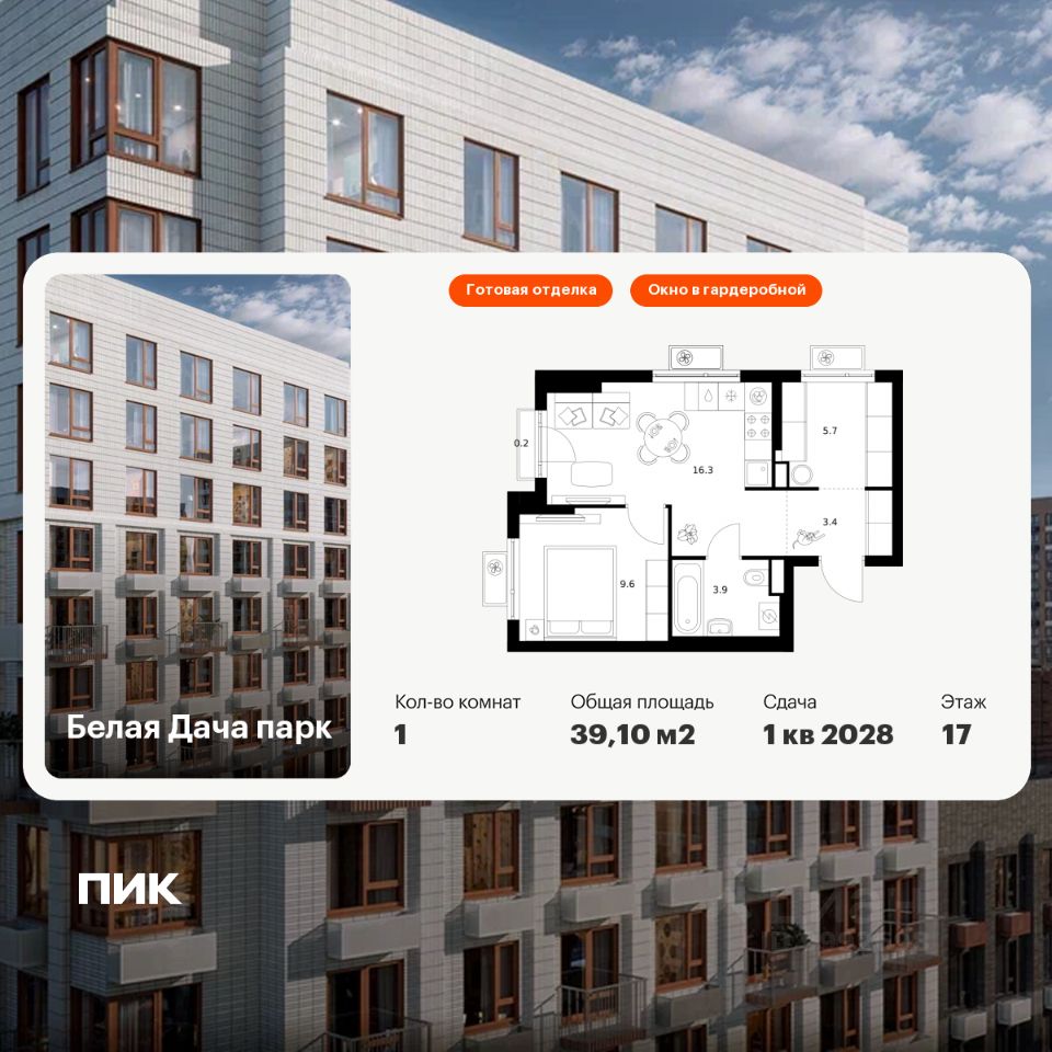 Продаётся 1-комн. квартира площадью 39,1 кв.м на 17 этаже 25 этажного дома (Корпус 16.1, Секция 1) проекта ПИК Белая Дача парк. Светлый просторный подъезд на уровне земли, функциональная планировка, большие окна, c отделкой.