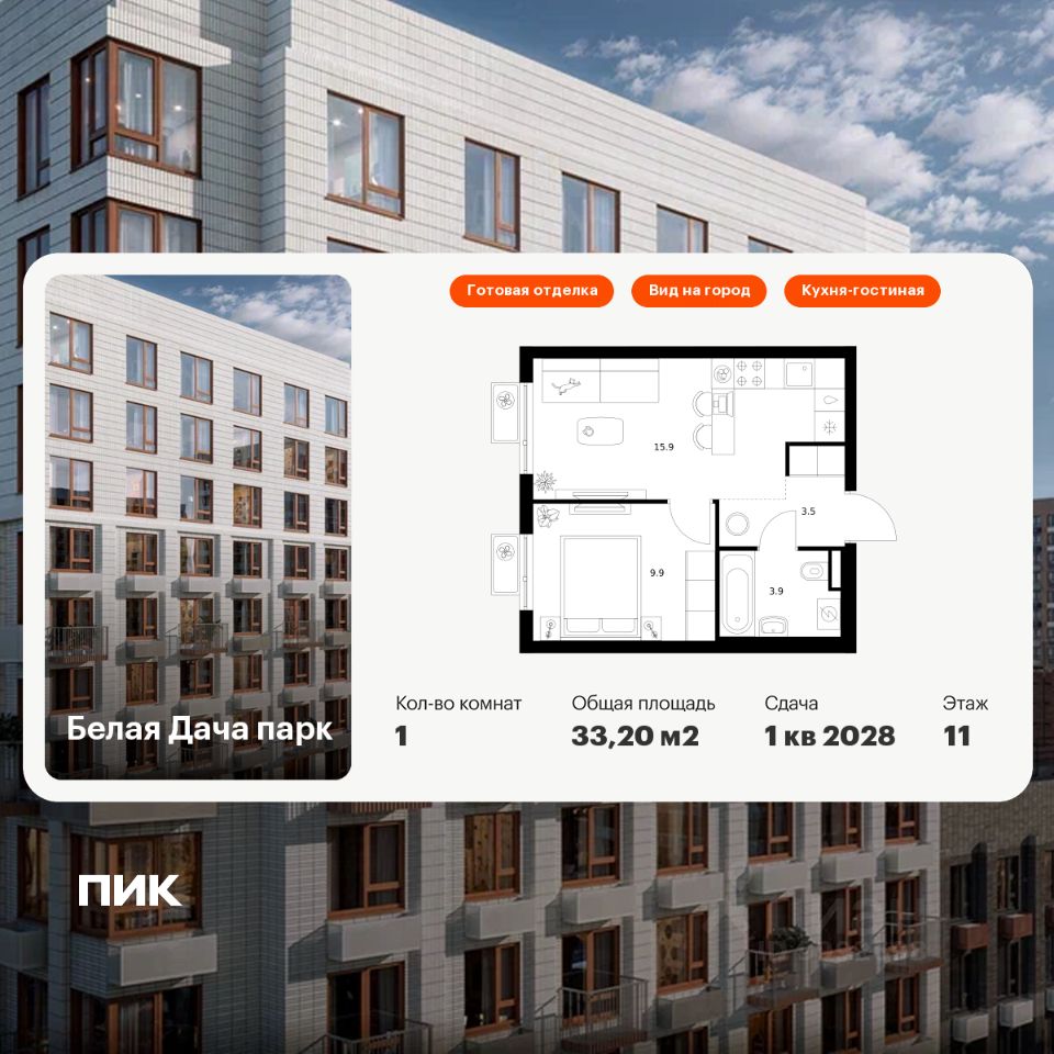 Продаётся 1-комн. квартира площадью 33,2 кв.м на 11 этаже 25 этажного дома (Корпус 16.1, Секция 1) проекта ПИК Белая Дача парк. Светлый просторный подъезд на уровне земли, функциональная планировка, большие окна, c отделкой.
