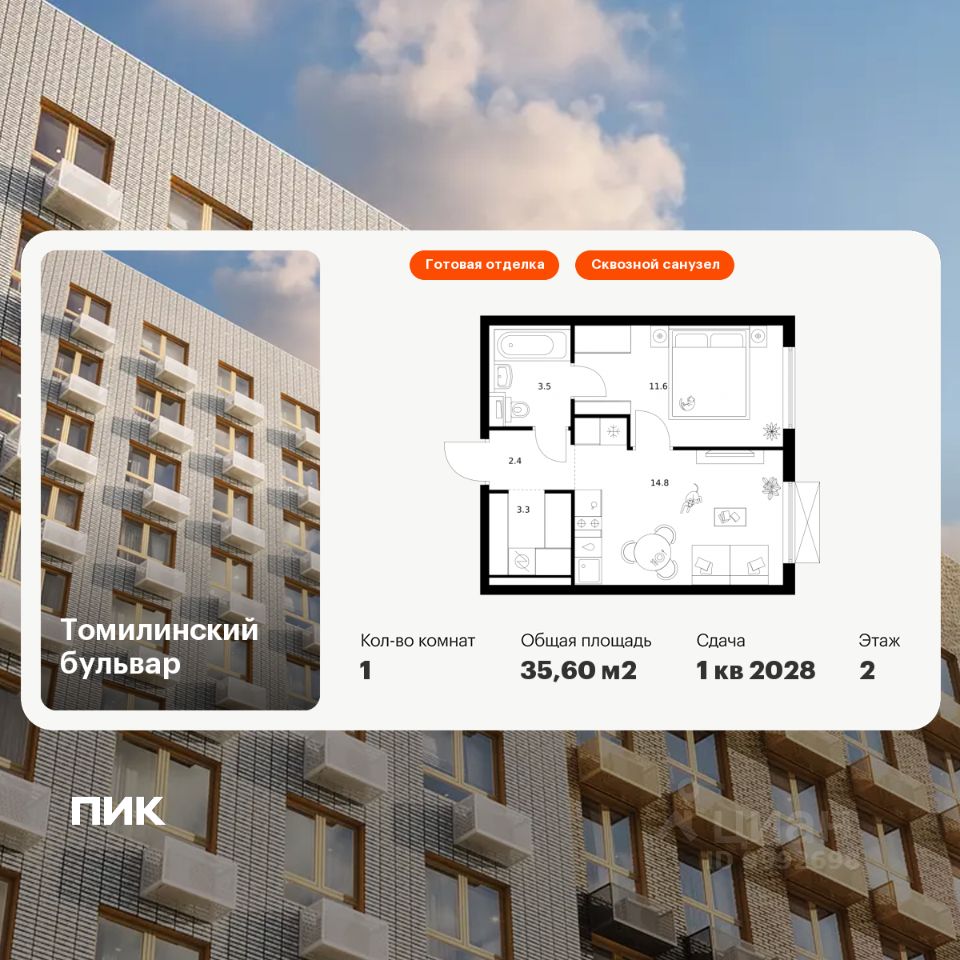 Продаётся 1-комн. квартира площадью 35,6 кв.м на 2 этаже 25 этажного дома (Корпус 5-8, Секция 2) проекта ПИК Томилинский бульвар. Светлый просторный подъезд на уровне земли, функциональная планировка, большие окна, c отделкой.