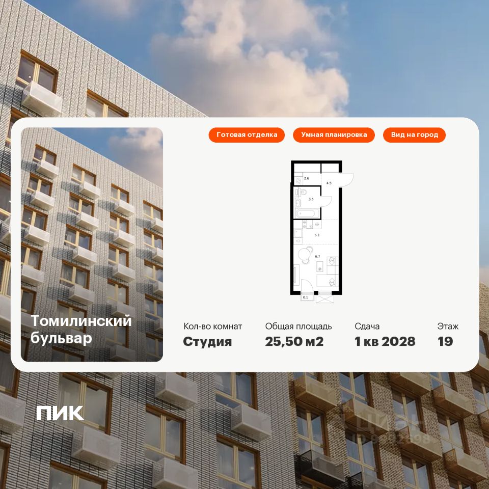 Продаётся квартира-студия площадью 25,5 кв.м на 19 этаже 25 этажного дома (Корпус 5-8, Секция 1) проекта ПИК Томилинский бульвар. Светлый просторный подъезд на уровне земли, функциональная планировка, большие окна, c отделкой.