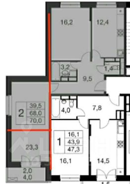 Три комнаты. Первая 16,2 м, вторая 12м, третья 11,3. Есть возможность сделать 2 комнаты (16 м. и 23 м.)