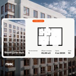 Продаётся 1-комн. квартира площадью 45,6 кв.м на 14 этаже 15 этажного дома (Корпус 7.2, Секция 6) проекта ПИК Белая Дача парк. Светлый просторный подъезд на уровне земли, функциональная планировка, большие окна, c отделкой.