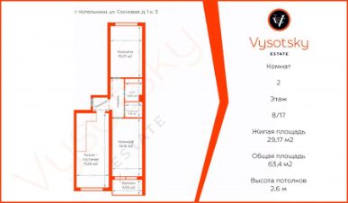 Площадь по ЕГРН - 63.4 м2. Окна выходят на 2 стороны.