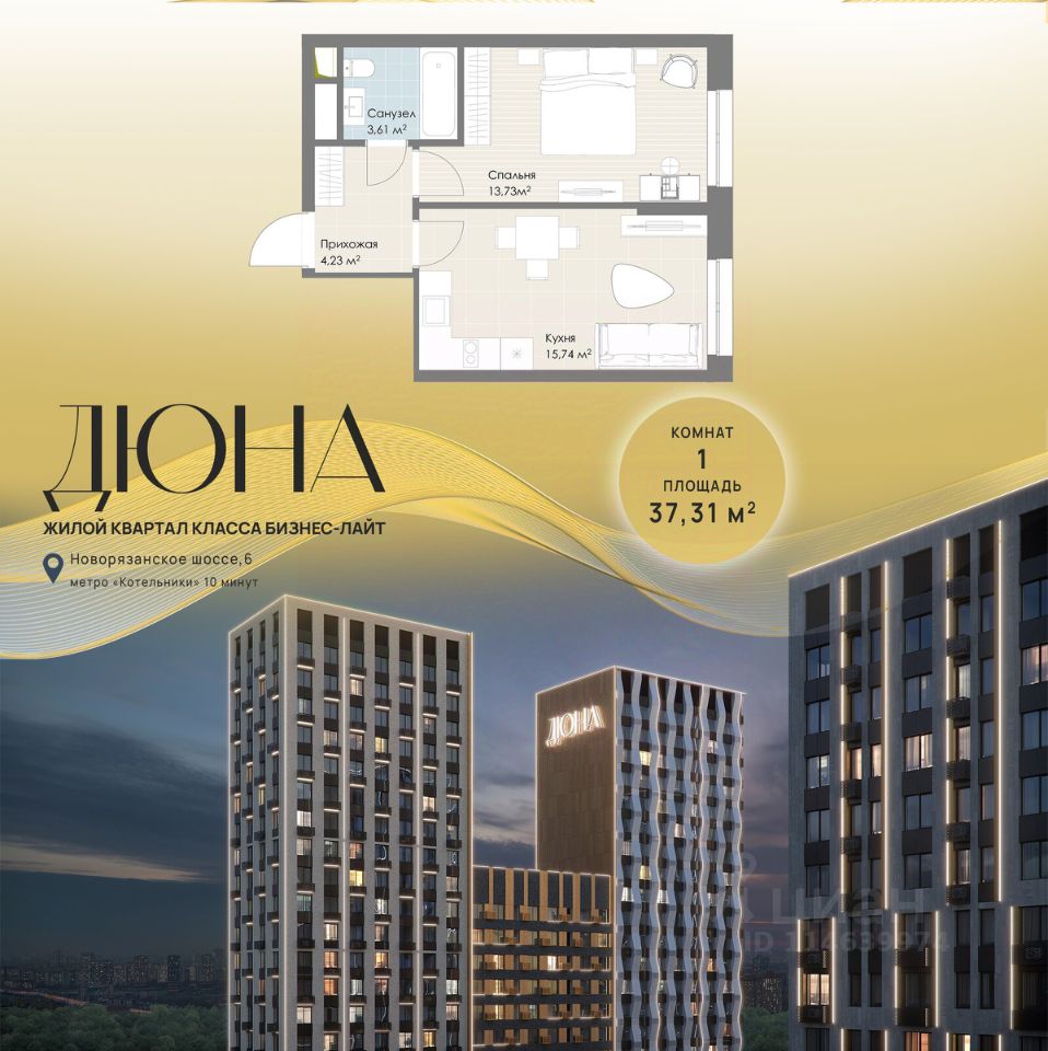 Современный жилой квартал бизнес-класса "Дюна" расположен в 10 минутах ходьбы от станции метро "Котельники" (1,2 км) на пересечении Новорязанского и Дзержинского шоссе. Квартал находится в районе с развитой инфраструктурой: в непосредственной близости расположены школы, детские сады, поликлиники, а также гипермаркеты и торговые комплексы, такие как "Metro", "Глобус", "Лемана Про" (Леруа Мерлен), "МЕГА Белая Дача", "Outlet Village Белая Дача" и другие. В шаговой доступности находятся физкультурно-оздоровительный комплекс с бассейном и теннисными кортами, а также благоустроенный лесопарк "Кузьминки" площадью 1189 га. Неподалёку расположены пляжи Дзержинских карьеров с экстрим-парком и горнолыжными трассами, Томилинский лесопарк с лыжной базой и Жулебинский лесопарк. Застройщик реализует современную урбанистическую концепцию "Город в городе", которая подразумевает наличие собственной полноценной инфраструктуры на территории жилого комплекса, включая школу, детские сады, торговую галерею, бизнес-центр, пункт полиции и медицинский центр. Общая площадь застройки составляет 12,2 га. Квартиры представлены в диапазоне планировок от студий до четырёхкомнатных, в обычном и евроформате. На этажах расположено от 3 до 4 бесшумных скоростных лифтов при количестве квартир от 4 до 7 на этаже. Квартиры сдаются с предчистовой отделкой (white box). Здания переменной этажности строятся по технологии монолит-кирпич, а фасады выполнены с использованием инновационной системы вентилируемого комбинированного фасада.Комфорт на внутренней территории обеспечивается за счёт принципа "двор без машин", системы доступа по карте и круглосуточного видеонаблюдения. Приобрести квартиру можно с использованием материнского капитала, беспроцентной рассрочки или ипотечных программ. При 100% оплате предусмотрены индивидуальные условия.