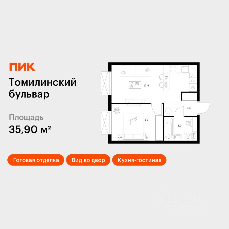 Продаётся 1-комн. квартира площадью 35,9 кв.м на 12 этаже 25 этажного дома (Корпус 5-8, Секция 2) проекта ПИК Томилинский бульвар. Светлый просторный подъезд на уровне земли, функциональная планировка, большие окна, c отделкой.