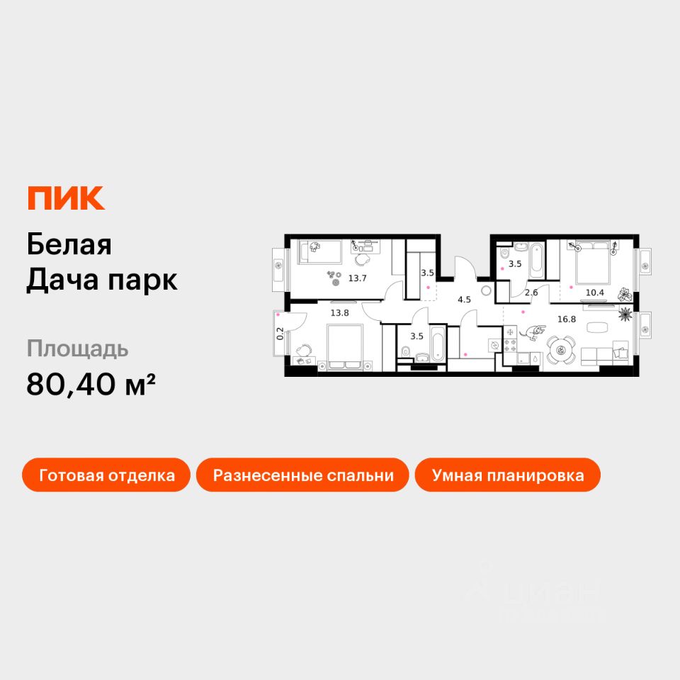Продаётся 3-комн. квартира площадью 80,4 кв.м на 4 этаже 20 этажного дома (Корпус 16.2, Секция 7) проекта ПИК Белая Дача парк. Светлый просторный подъезд на уровне земли, функциональная планировка, большие окна, c отделкой.