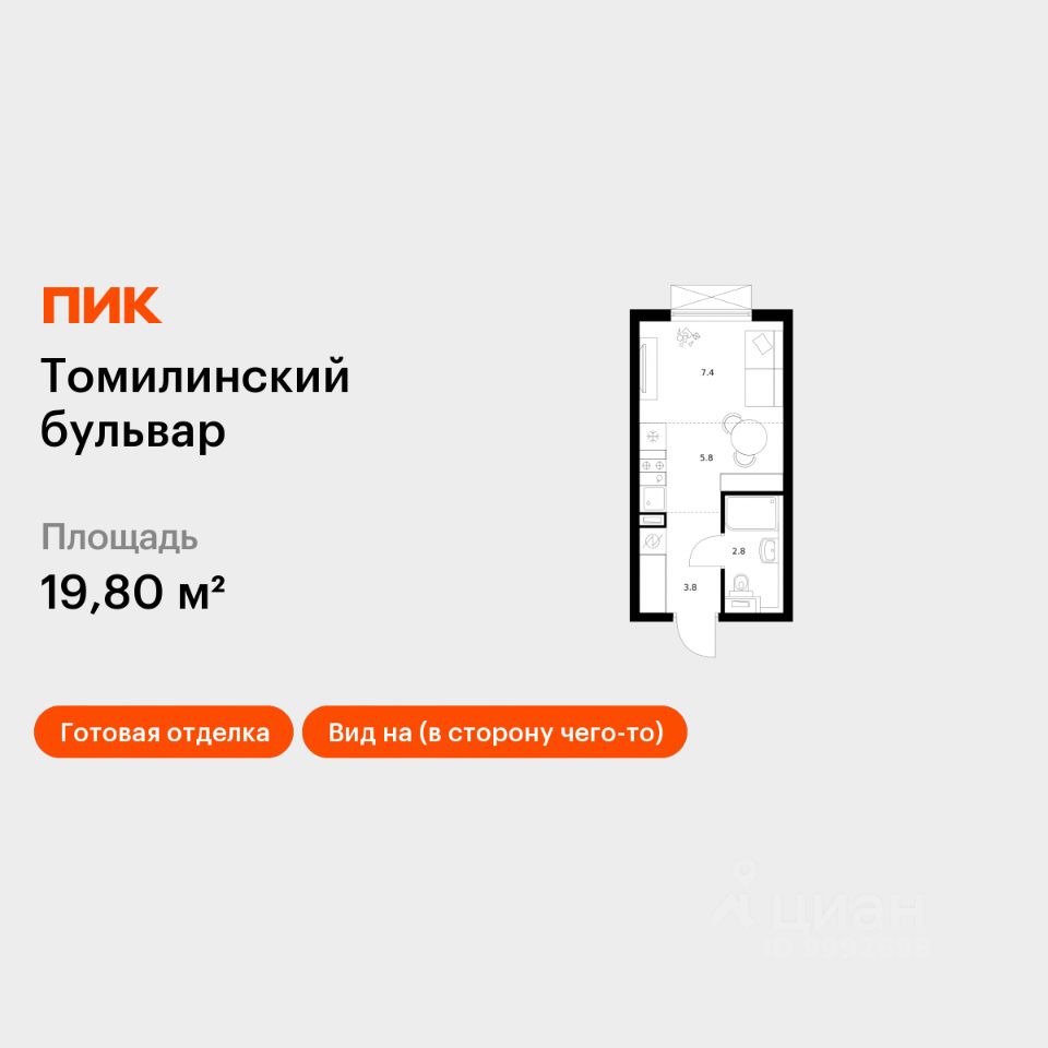 Продаётся квартира-студия площадью 19,8 кв.м на 9 этаже 25 этажного дома (Корпус 5-8, Секция 1) проекта ПИК Томилинский бульвар. Светлый просторный подъезд на уровне земли, функциональная планировка, большие окна, c отделкой.