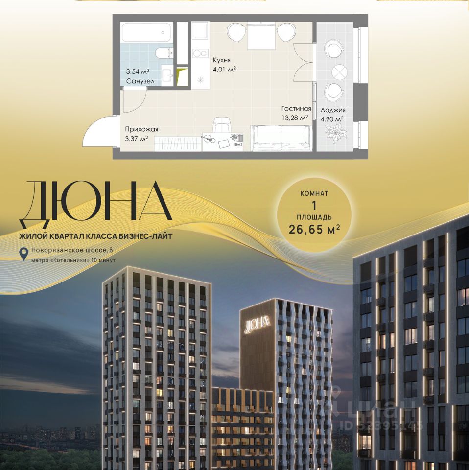 Продаётся 1-комнатная квартира в строящемся доме (Корпус 1), срок сдачи: III-кв. 2027, общей площадью 26.65 кв.м., на 20 этаже. Многоквартирный жилой комплекс с подземной автостоянкой и встроенно-пристроенным ДОУ на 120 мест по адресу: Московская область, г.о. Котельники, Новорязанское шоссе, вл. 6, комплекс 1