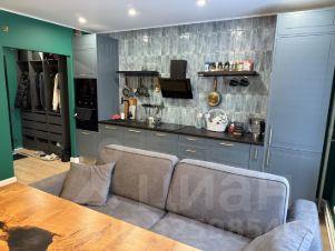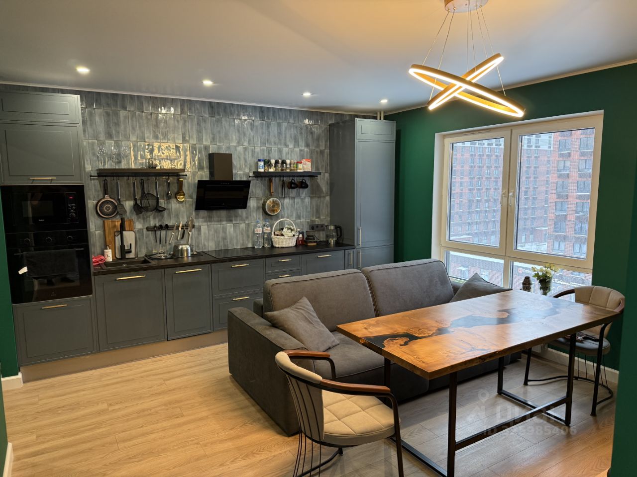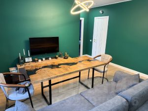 Квартира имеет кухню-гостинную с современным дизайном, мебелью и кухонным гарнитуром. На кухне установлен встроеннвй холодильник, посудомоечная машина, духовка и микроволновка. Также установлен дизайнерский стол (карагач + смола), размер 180х80 (100к)