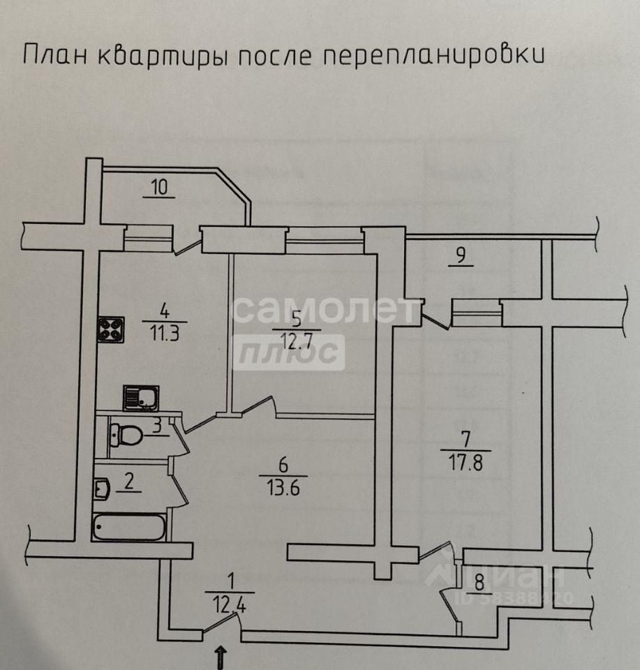 Арт. 128978857 Большая двухкомнатная квартира с дополнительной комнатой. Сделана перепланировка, согласована.