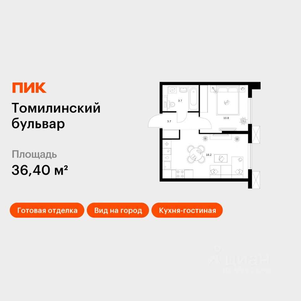 Продаётся 1-комн. квартира площадью 36,4 кв.м на 23 этаже 25 этажного дома (Корпус 5-8, Секция 2) проекта ПИК Томилинский бульвар. Светлый просторный подъезд на уровне земли, функциональная планировка, большие окна, c отделкой.