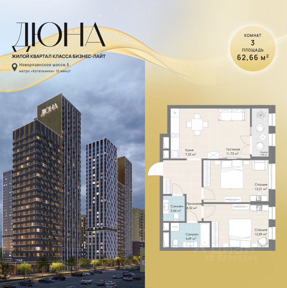 Продаётся 3-комнатная квартира в строящемся доме (Корпус 3), срок сдачи: II-кв. 2028, общей площадью 62.66 кв.м., на 3 этаже. Многоквартирный жилой комплекс с подземной автостоянкой и встроенно-пристроенным ДОУ на 120 мест по адресу: Московская область, г.о. Котельники, Новорязанское шоссе, вл. 6, комплекс 1