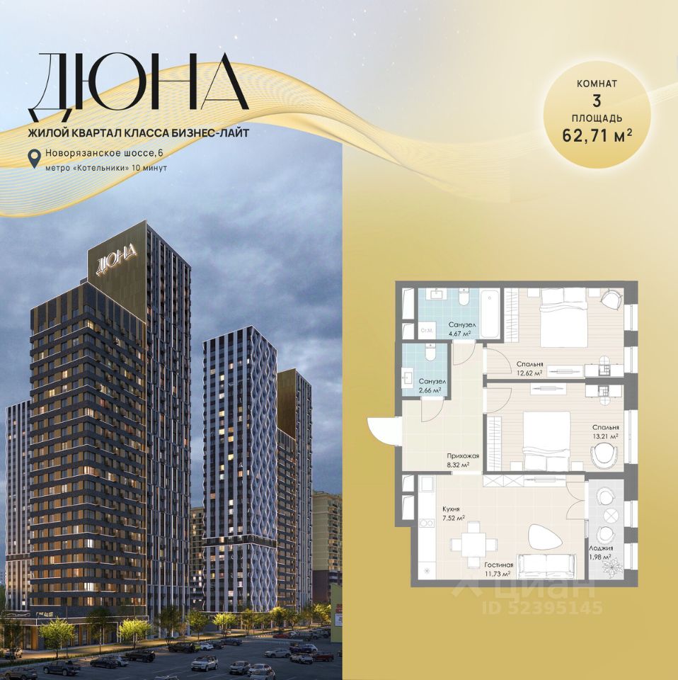 Продаётся 3-комнатная квартира в строящемся доме (Корпус 3), срок сдачи: II-кв. 2028, общей площадью 62.71 кв.м., на 28 этаже. Многоквартирный жилой комплекс с подземной автостоянкой и встроенно-пристроенным ДОУ на 120 мест по адресу: Московская область, г.о. Котельники, Новорязанское шоссе, вл. 6, комплекс 1