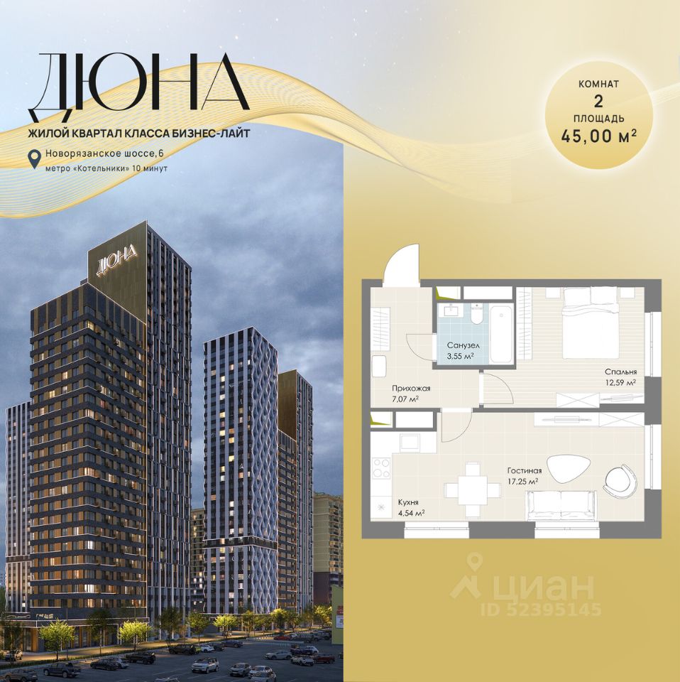 Продаётся 2-комнатная квартира в строящемся доме (Корпус 1), срок сдачи: III-кв. 2027, общей площадью 45 кв.м., на 20 этаже. Многоквартирный жилой комплекс с подземной автостоянкой и встроенно-пристроенным ДОУ на 120 мест по адресу: Московская область, г.о. Котельники, Новорязанское шоссе, вл. 6, комплекс 1
