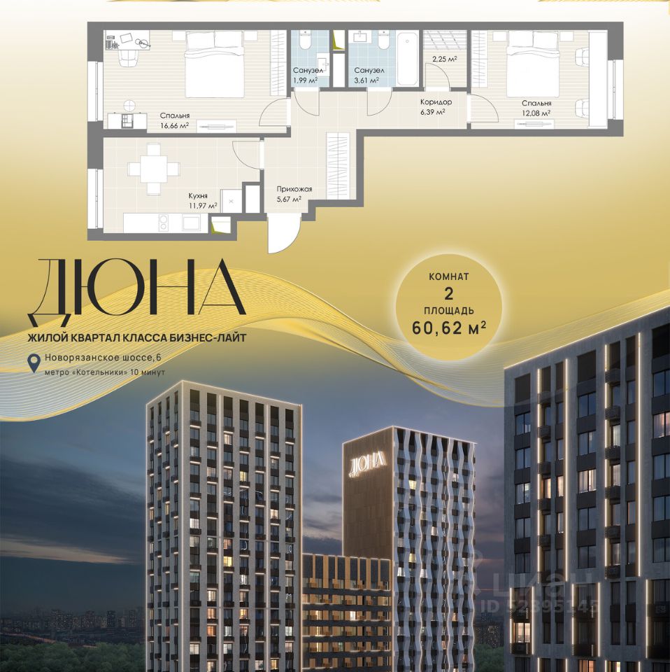 Продаётся 2-комнатная квартира в строящемся доме (Корпус 1), срок сдачи: III-кв. 2027, общей площадью 60.62 кв.м., на 9 этаже. Многоквартирный жилой комплекс с подземной автостоянкой и встроенно-пристроенным ДОУ на 120 мест по адресу: Московская область, г.о. Котельники, Новорязанское шоссе, вл. 6, комплекс 1