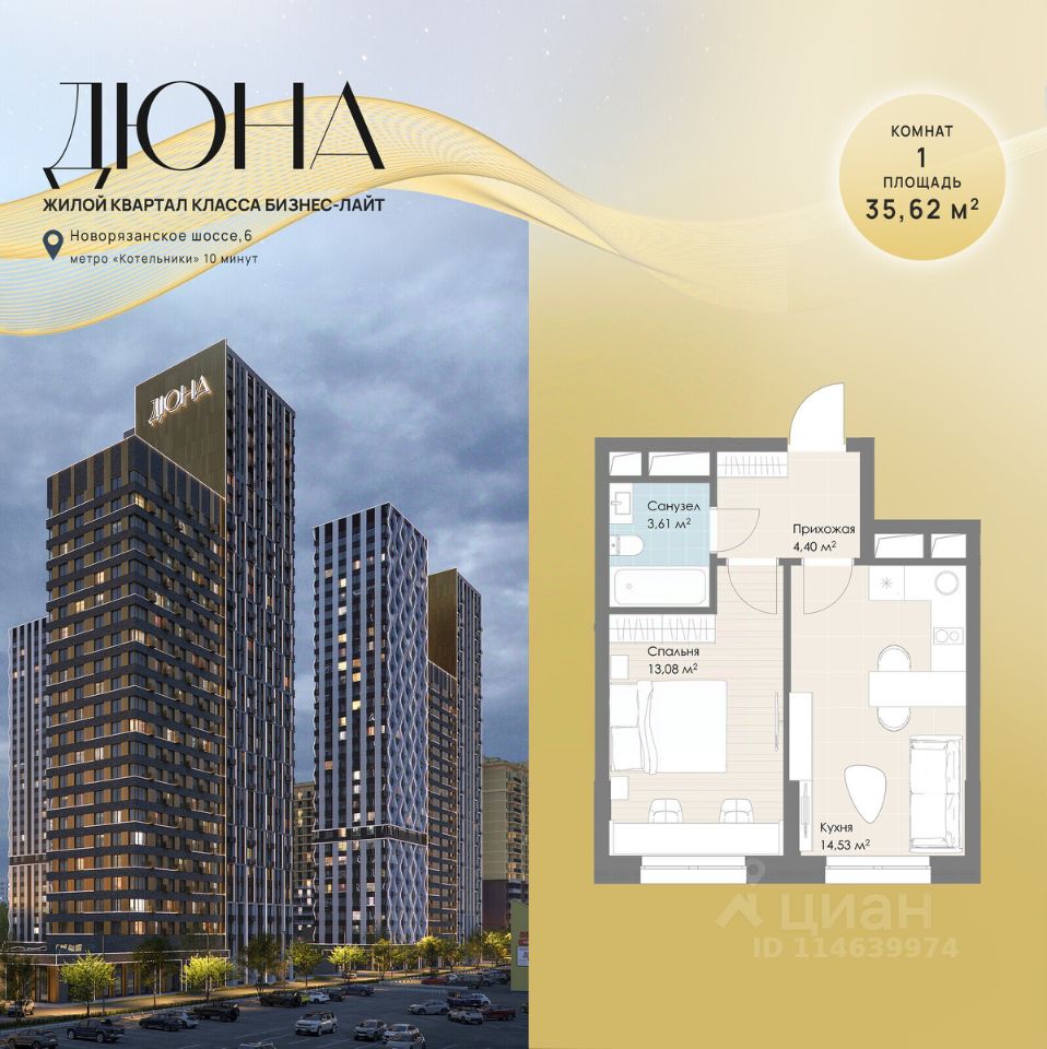 Современный жилой квартал бизнес-класса "Дюна" расположен в 10 минутах ходьбы от станции метро "Котельники" (1,2 км) на пересечении Новорязанского и Дзержинского шоссе. Квартал находится в районе с развитой инфраструктурой: в непосредственной близости расположены школы, детские сады, поликлиники, а также гипермаркеты и торговые комплексы, такие как "Metro", "Глобус", "Лемана Про" (Леруа Мерлен), "МЕГА Белая Дача", "Outlet Village Белая Дача" и другие. В шаговой доступности находятся физкультурно-оздоровительный комплекс с бассейном и теннисными кортами, а также благоустроенный лесопарк "Кузьминки" площадью 1189 га. Неподалёку расположены пляжи Дзержинских карьеров с экстрим-парком и горнолыжными трассами, Томилинский лесопарк с лыжной базой и Жулебинский лесопарк. Застройщик реализует современную урбанистическую концепцию "Город в городе", которая подразумевает наличие собственной полноценной инфраструктуры на территории жилого комплекса, включая школу, детские сады, торговую галерею, бизнес-центр, пункт полиции и медицинский центр. Общая площадь застройки составляет 12,2 га. Квартиры представлены в диапазоне планировок от студий до четырёхкомнатных, в обычном и евроформате. На этажах расположено от 3 до 4 бесшумных скоростных лифтов при количестве квартир от 4 до 7 на этаже. Квартиры сдаются с предчистовой отделкой (white box). Здания переменной этажности строятся по технологии монолит-кирпич, а фасады выполнены с использованием инновационной системы вентилируемого комбинированного фасада.Комфорт на внутренней территории обеспечивается за счёт принципа "двор без машин", системы доступа по карте и круглосуточного видеонаблюдения. Приобрести квартиру можно с использованием материнского капитала, беспроцентной рассрочки или ипотечных программ. При 100% оплате предусмотрены индивидуальные условия.