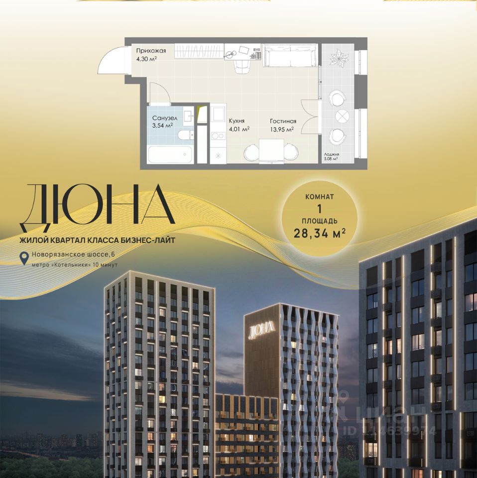 Современный жилой квартал бизнес-класса "Дюна" расположен в 10 минутах ходьбы от станции метро "Котельники" (1,2 км) на пересечении Новорязанского и Дзержинского шоссе. Квартал находится в районе с развитой инфраструктурой: в непосредственной близости расположены школы, детские сады, поликлиники, а также гипермаркеты и торговые комплексы, такие как "Metro", "Глобус", "Лемана Про" (Леруа Мерлен), "МЕГА Белая Дача", "Outlet Village Белая Дача" и другие. В шаговой доступности находятся физкультурно-оздоровительный комплекс с бассейном и теннисными кортами, а также благоустроенный лесопарк "Кузьминки" площадью 1189 га. Неподалёку расположены пляжи Дзержинских карьеров с экстрим-парком и горнолыжными трассами, Томилинский лесопарк с лыжной базой и Жулебинский лесопарк. Застройщик реализует современную урбанистическую концепцию "Город в городе", которая подразумевает наличие собственной полноценной инфраструктуры на территории жилого комплекса, включая школу, детские сады, торговую галерею, бизнес-центр, пункт полиции и медицинский центр. Общая площадь застройки составляет 12,2 га. Квартиры представлены в диапазоне планировок от студий до четырёхкомнатных, в обычном и евроформате. На этажах расположено от 3 до 4 бесшумных скоростных лифтов при количестве квартир от 4 до 7 на этаже. Квартиры сдаются с предчистовой отделкой (white box). Здания переменной этажности строятся по технологии монолит-кирпич, а фасады выполнены с использованием инновационной системы вентилируемого комбинированного фасада.Комфорт на внутренней территории обеспечивается за счёт принципа "двор без машин", системы доступа по карте и круглосуточного видеонаблюдения. Приобрести квартиру можно с использованием материнского капитала, беспроцентной рассрочки или ипотечных программ. При 100% оплате предусмотрены индивидуальные условия.