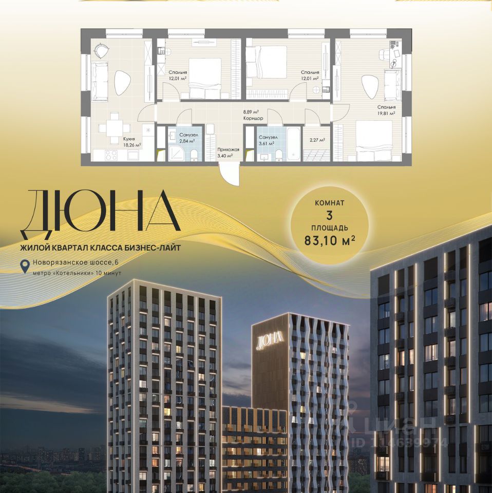 Современный жилой квартал бизнес-класса "Дюна" расположен в 10 минутах ходьбы от станции метро "Котельники" (1,2 км) на пересечении Новорязанского и Дзержинского шоссе. Квартал находится в районе с развитой инфраструктурой: в непосредственной близости расположены школы, детские сады, поликлиники, а также гипермаркеты и торговые комплексы, такие как "Metro", "Глобус", "Лемана Про" (Леруа Мерлен), "МЕГА Белая Дача", "Outlet Village Белая Дача" и другие. В шаговой доступности находятся физкультурно-оздоровительный комплекс с бассейном и теннисными кортами, а также благоустроенный лесопарк "Кузьминки" площадью 1189 га. Неподалёку расположены пляжи Дзержинских карьеров с экстрим-парком и горнолыжными трассами, Томилинский лесопарк с лыжной базой и Жулебинский лесопарк. Застройщик реализует современную урбанистическую концепцию "Город в городе", которая подразумевает наличие собственной полноценной инфраструктуры на территории жилого комплекса, включая школу, детские сады, торговую галерею, бизнес-центр, пункт полиции и медицинский центр. Общая площадь застройки составляет 12,2 га. Квартиры представлены в диапазоне планировок от студий до четырёхкомнатных, в обычном и евроформате. На этажах расположено от 3 до 4 бесшумных скоростных лифтов при количестве квартир от 4 до 7 на этаже. Квартиры сдаются с предчистовой отделкой (white box). Здания переменной этажности строятся по технологии монолит-кирпич, а фасады выполнены с использованием инновационной системы вентилируемого комбинированного фасада.Комфорт на внутренней территории обеспечивается за счёт принципа "двор без машин", системы доступа по карте и круглосуточного видеонаблюдения. Приобрести квартиру можно с использованием материнского капитала, беспроцентной рассрочки или ипотечных программ. При 100% оплате предусмотрены индивидуальные условия.