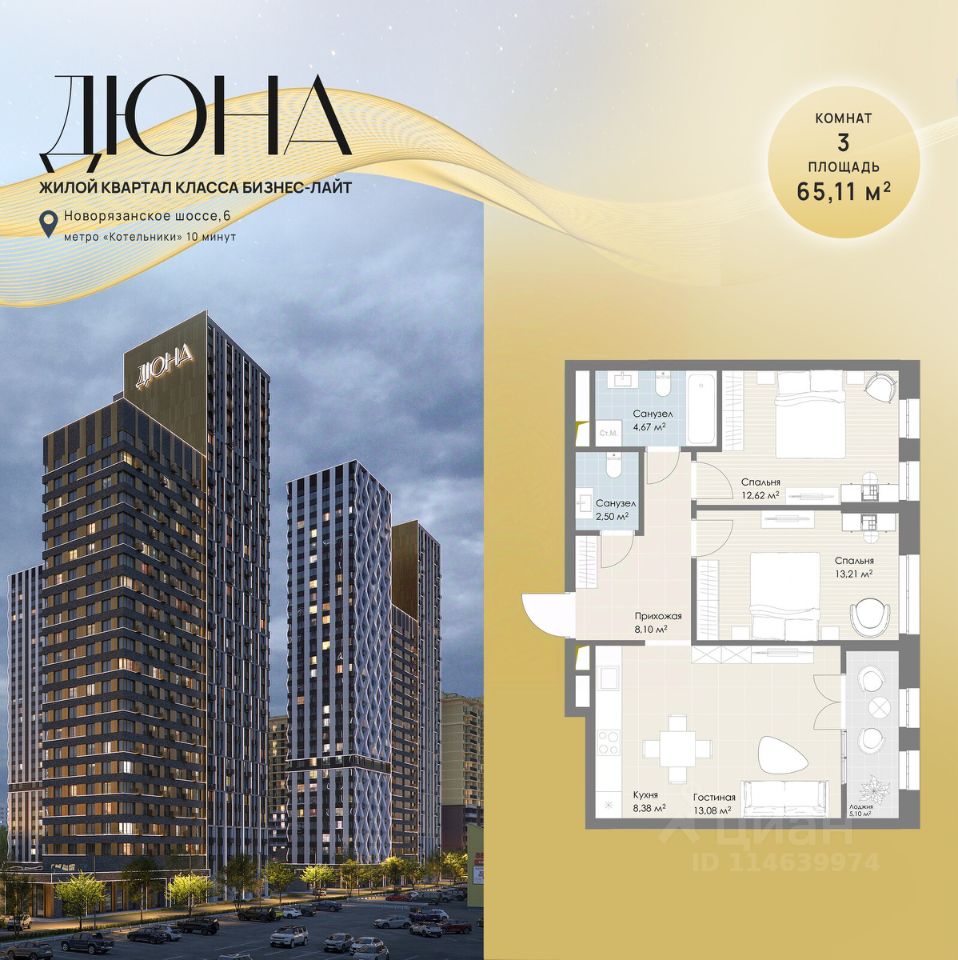 Современный жилой квартал бизнес-класса "Дюна" расположен в 10 минутах ходьбы от станции метро "Котельники" (1,2 км) на пересечении Новорязанского и Дзержинского шоссе. Квартал находится в районе с развитой инфраструктурой: в непосредственной близости расположены школы, детские сады, поликлиники, а также гипермаркеты и торговые комплексы, такие как "Metro", "Глобус", "Лемана Про" (Леруа Мерлен), "МЕГА Белая Дача", "Outlet Village Белая Дача" и другие. В шаговой доступности находятся физкультурно-оздоровительный комплекс с бассейном и теннисными кортами, а также благоустроенный лесопарк "Кузьминки" площадью 1189 га. Неподалёку расположены пляжи Дзержинских карьеров с экстрим-парком и горнолыжными трассами, Томилинский лесопарк с лыжной базой и Жулебинский лесопарк. Застройщик реализует современную урбанистическую концепцию "Город в городе", которая подразумевает наличие собственной полноценной инфраструктуры на территории жилого комплекса, включая школу, детские сады, торговую галерею, бизнес-центр, пункт полиции и медицинский центр. Общая площадь застройки составляет 12,2 га. Квартиры представлены в диапазоне планировок от студий до четырёхкомнатных, в обычном и евроформате. На этажах расположено от 3 до 4 бесшумных скоростных лифтов при количестве квартир от 4 до 7 на этаже. Квартиры сдаются с предчистовой отделкой (white box). Здания переменной этажности строятся по технологии монолит-кирпич, а фасады выполнены с использованием инновационной системы вентилируемого комбинированного фасада.Комфорт на внутренней территории обеспечивается за счёт принципа "двор без машин", системы доступа по карте и круглосуточного видеонаблюдения. Приобрести квартиру можно с использованием материнского капитала, беспроцентной рассрочки или ипотечных программ. При 100% оплате предусмотрены индивидуальные условия.