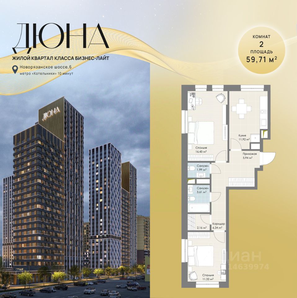 Современный жилой квартал бизнес-класса "Дюна" расположен в 10 минутах ходьбы от станции метро "Котельники" (1,2 км) на пересечении Новорязанского и Дзержинского шоссе. Квартал находится в районе с развитой инфраструктурой: в непосредственной близости расположены школы, детские сады, поликлиники, а также гипермаркеты и торговые комплексы, такие как "Metro", "Глобус", "Лемана Про" (Леруа Мерлен), "МЕГА Белая Дача", "Outlet Village Белая Дача" и другие. В шаговой доступности находятся физкультурно-оздоровительный комплекс с бассейном и теннисными кортами, а также благоустроенный лесопарк "Кузьминки" площадью 1189 га. Неподалёку расположены пляжи Дзержинских карьеров с экстрим-парком и горнолыжными трассами, Томилинский лесопарк с лыжной базой и Жулебинский лесопарк. Застройщик реализует современную урбанистическую концепцию "Город в городе", которая подразумевает наличие собственной полноценной инфраструктуры на территории жилого комплекса, включая школу, детские сады, торговую галерею, бизнес-центр, пункт полиции и медицинский центр. Общая площадь застройки составляет 12,2 га. Квартиры представлены в диапазоне планировок от студий до четырёхкомнатных, в обычном и евроформате. На этажах расположено от 3 до 4 бесшумных скоростных лифтов при количестве квартир от 4 до 7 на этаже. Квартиры сдаются с предчистовой отделкой (white box). Здания переменной этажности строятся по технологии монолит-кирпич, а фасады выполнены с использованием инновационной системы вентилируемого комбинированного фасада.Комфорт на внутренней территории обеспечивается за счёт принципа "двор без машин", системы доступа по карте и круглосуточного видеонаблюдения. Приобрести квартиру можно с использованием материнского капитала, беспроцентной рассрочки или ипотечных программ. При 100% оплате предусмотрены индивидуальные условия.
