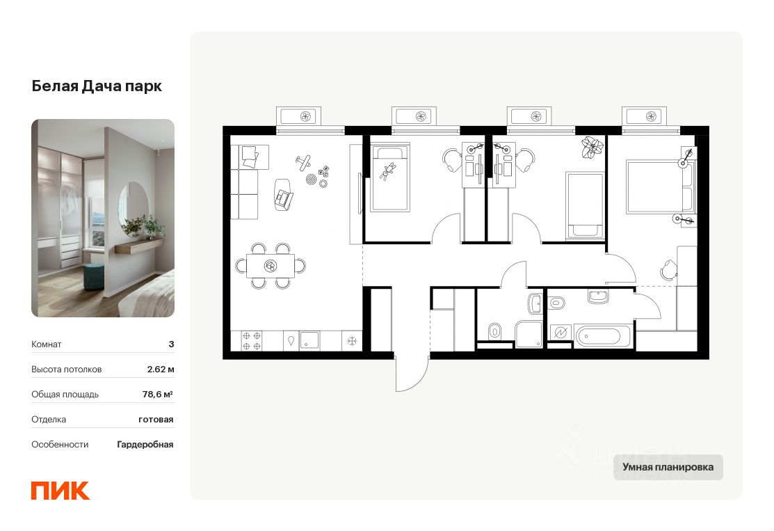 Продаётся 3-комн. квартира площадью 78,6 кв.м на 5 этаже 15 этажного дома (Корпус 16.2, Секция 6) проекта ПИК Белая Дача парк. Светлый просторный подъезд на уровне земли, функциональная планировка, большие окна, c отделкой.
