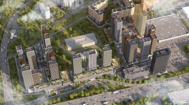 Инфраструктура: Прямо на территории комплекса строятся собственная школа на 1100 мест и детские сады. В шаговой доступности — МФЦ, фитнес-центр со SPA, супермаркеты и коворкинг.