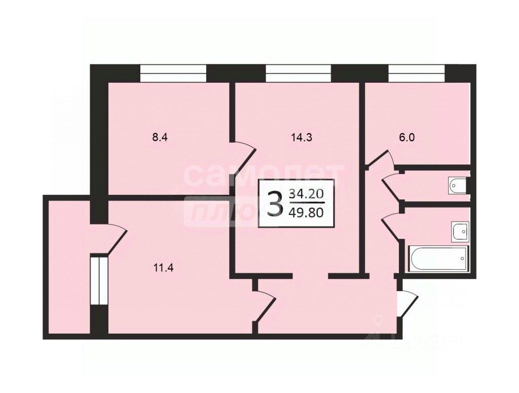 Квартира со смежно-изолированной планировкой: комнаты (14.3+11.4+8.5), кухня 6 кв.м., раздельный с/у, просторный коридор, балкон.