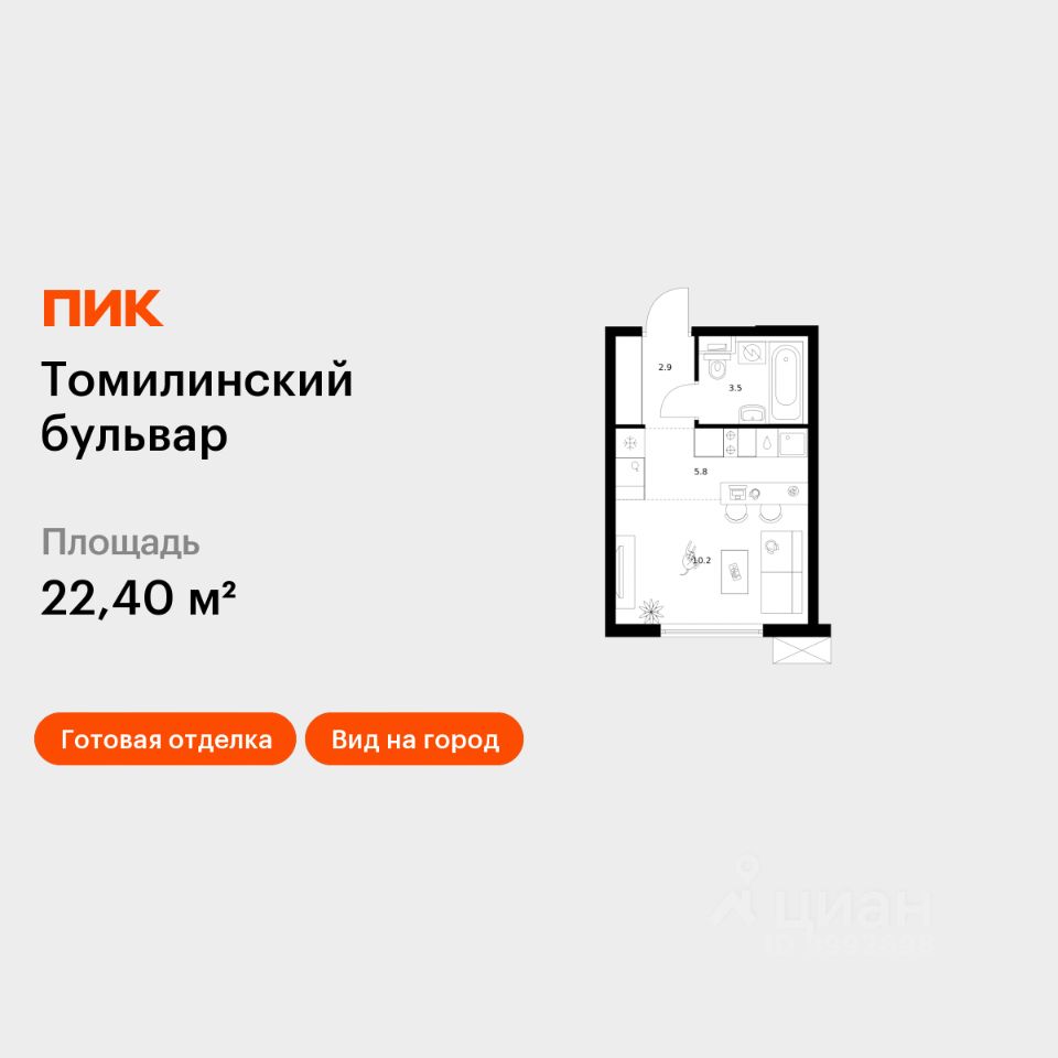 Продаётся квартира-студия площадью 22,4 кв.м на 8 этаже 25 этажного дома (Корпус 5-8, Секция 2) проекта ПИК Томилинский бульвар. Светлый просторный подъезд на уровне земли, функциональная планировка, большие окна, c отделкой.