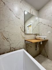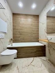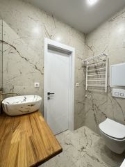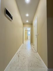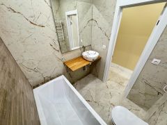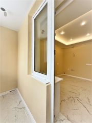 Теплое остекление квартиры, разноуровневое освещение, скрытый карниз, стены покрашены, керамогранит, установлен теплый пол, новая входная дверь, сантехника, ванная, инсталляция, раковина, электрический полотенцесушитель.