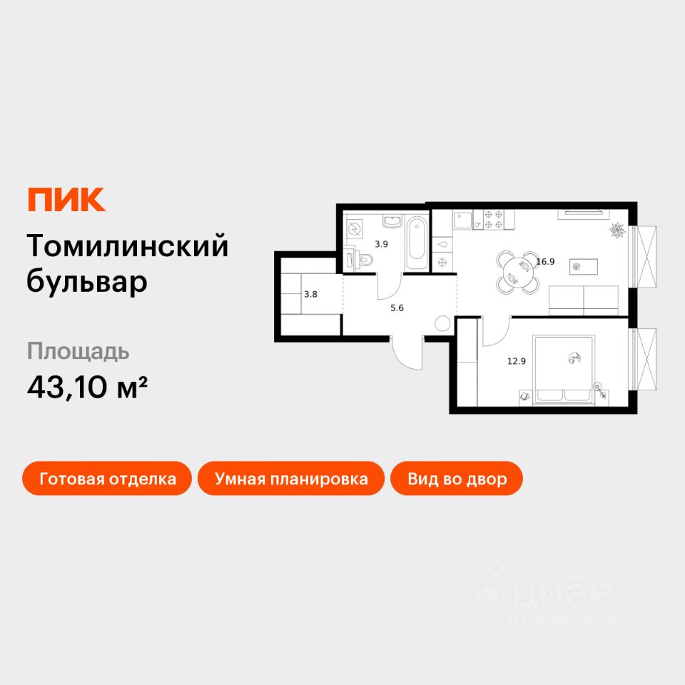 Продаётся 1-комн. квартира площадью 43,1 кв.м на 18 этаже 25 этажного дома (Корпус 5-8, Секция 1) проекта ПИК Томилинский бульвар. Светлый просторный подъезд на уровне земли, функциональная планировка, большие окна, c отделкой.