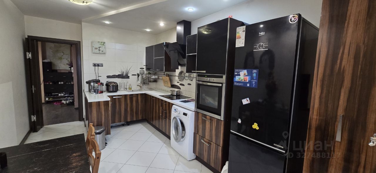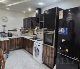 На кухне — встроенный гарнитур, вся техника: варочная панель, духовка, холодильник, вытяжка, посудомоечная машина.