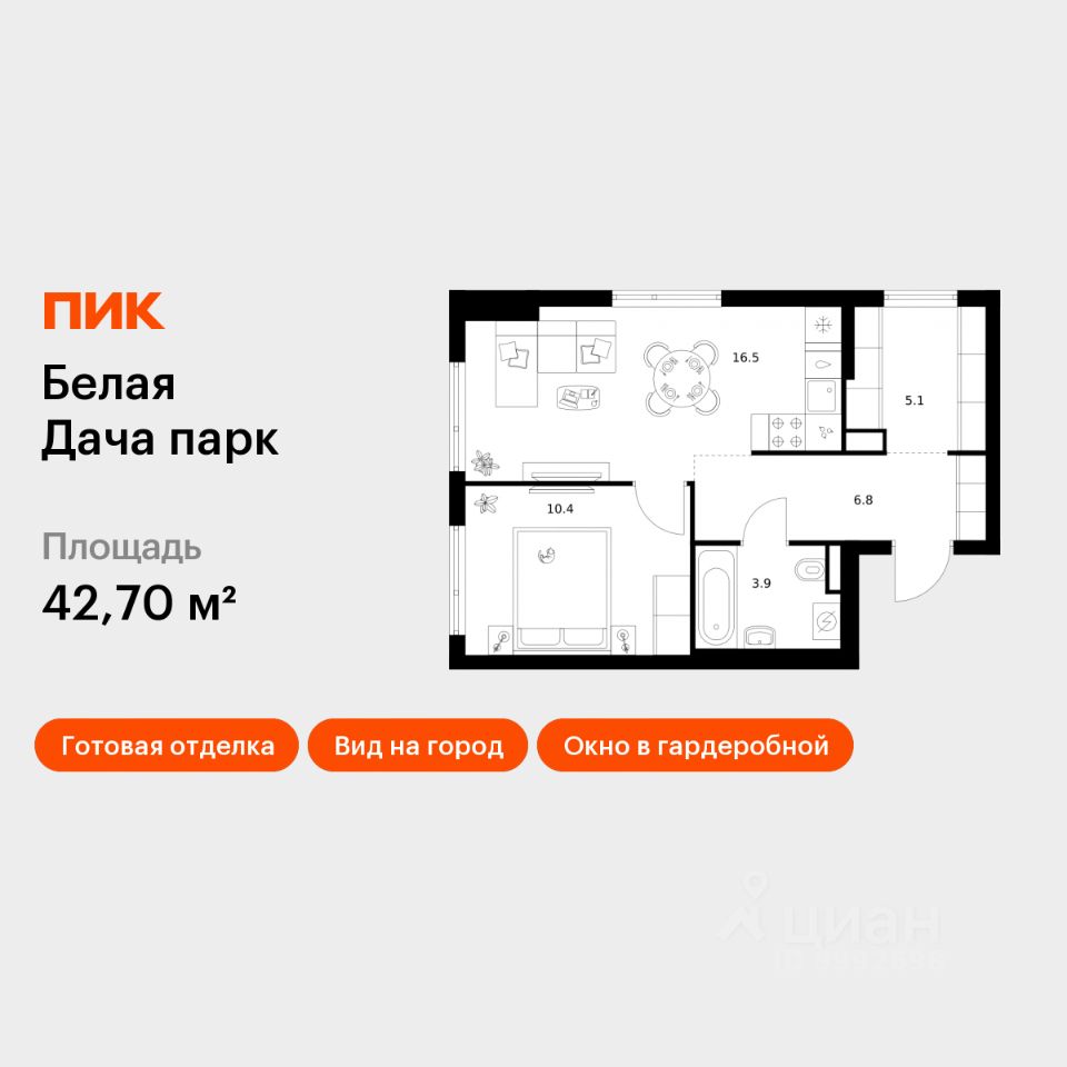 Продаётся 1-комн. квартира площадью 42,7 кв.м на 24 этаже 25 этажного дома (Корпус 22.2, Секция 6) проекта ПИК Белая Дача парк. Светлый просторный подъезд на уровне земли, функциональная планировка, большие окна, c отделкой.