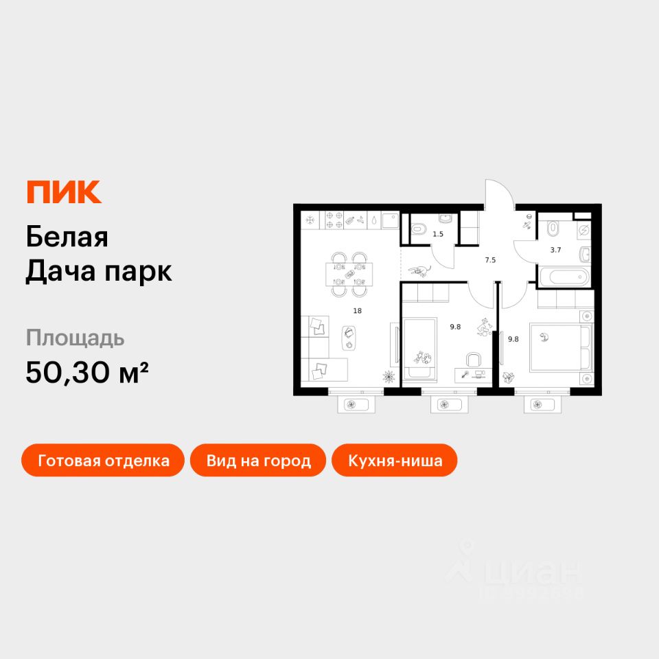 Продаётся 2-комн. квартира площадью 50,3 кв.м на 4 этаже 25 этажного дома (Корпус 22.2, Секция 6) проекта ПИК Белая Дача парк. Светлый просторный подъезд на уровне земли, функциональная планировка, большие окна, c отделкой.