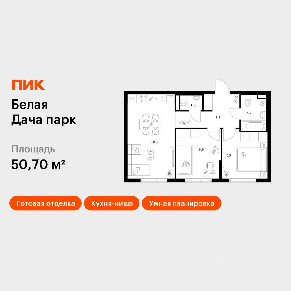 Продаётся 2-комн. квартира площадью 50,7 кв.м на 24 этаже 25 этажного дома (Корпус 22.2, Секция 6) проекта ПИК Белая Дача парк. Светлый просторный подъезд на уровне земли, функциональная планировка, большие окна, c отделкой.