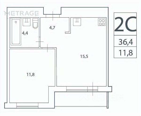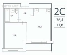 Кухня-гостиная 15,50 м², спальня 11,8 м², совмещенный санузел 4,40 м², балкон 1.8 м².