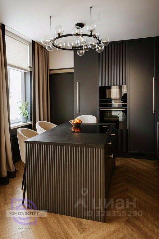 Основная площадь квартиры составляет 75,9 кв. м, из которых 45 кв. м — это жилая площадь, что обеспечивает достаточно пространства для жизни всей семьи. Просторная кухня площадью 21 кв. м с островом — настоящее сердце квартиры, укомплектована качественной встроенной техникой, включая большую индукционную плиту, холодильник и морозильник. Плюс, для вашего удобства, имеются стиральная и сушильная машины в отдельной прачечной.
