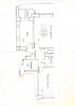 - общая площадь 71 кв. м. (с лоджией), жилая площадь 39 кв. м. (23, 16 кв. м., изолированные), кухня 16 кв. м., с/у разд.