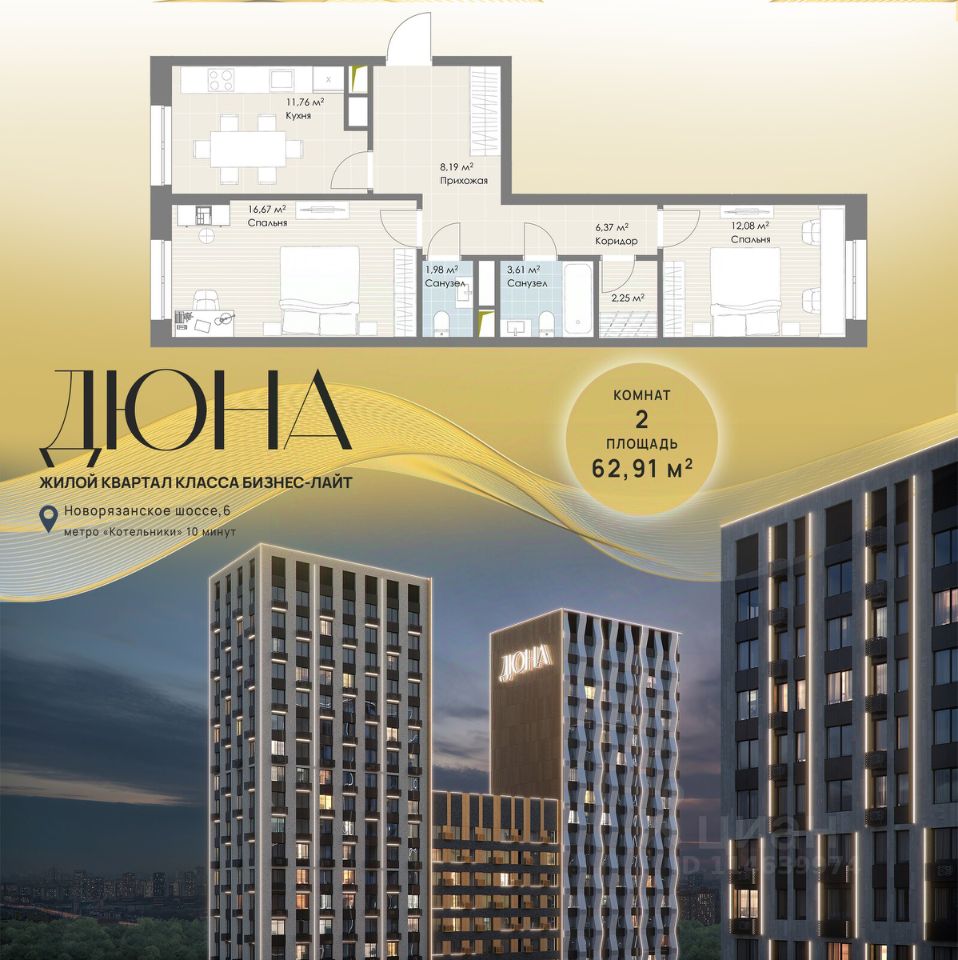 Современный жилой квартал бизнес-класса "Дюна" расположен в 10 минутах ходьбы от станции метро "Котельники" (1,2 км) на пересечении Новорязанского и Дзержинского шоссе. Квартал находится в районе с развитой инфраструктурой: в непосредственной близости расположены школы, детские сады, поликлиники, а также гипермаркеты и торговые комплексы, такие как "Metro", "Глобус", "Лемана Про" (Леруа Мерлен), "МЕГА Белая Дача", "Outlet Village Белая Дача" и другие. В шаговой доступности находятся физкультурно-оздоровительный комплекс с бассейном и теннисными кортами, а также благоустроенный лесопарк "Кузьминки" площадью 1189 га. Неподалёку расположены пляжи Дзержинских карьеров с экстрим-парком и горнолыжными трассами, Томилинский лесопарк с лыжной базой и Жулебинский лесопарк. Застройщик реализует современную урбанистическую концепцию "Город в городе", которая подразумевает наличие собственной полноценной инфраструктуры на территории жилого комплекса, включая школу, детские сады, торговую галерею, бизнес-центр, пункт полиции и медицинский центр. Общая площадь застройки составляет 12,2 га. Квартиры представлены в диапазоне планировок от студий до четырёхкомнатных, в обычном и евроформате. На этажах расположено от 3 до 4 бесшумных скоростных лифтов при количестве квартир от 4 до 7 на этаже. Квартиры сдаются с предчистовой отделкой (white box). Здания переменной этажности строятся по технологии монолит-кирпич, а фасады выполнены с использованием инновационной системы вентилируемого комбинированного фасада.Комфорт на внутренней территории обеспечивается за счёт принципа "двор без машин", системы доступа по карте и круглосуточного видеонаблюдения. Приобрести квартиру можно с использованием материнского капитала, беспроцентной рассрочки или ипотечных программ. При 100% оплате предусмотрены индивидуальные условия.