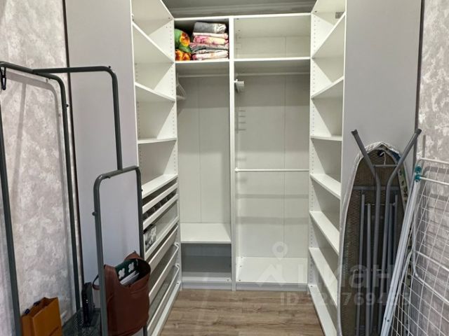 Дизайнерский вместительный шкаф с автоподсветкой в гардеробной.