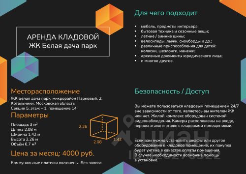 Ищете место, где можно хранить вещи без захламления квартиры? Сдаётся удобная кладовая в ЖК Белая дача парк (Котельники, МО) — секция 4, этаж 1, помещение 212. Площадь 4,2 м² и высота 2,28 м позволяют разместить всё, что мешает дома: сезонную одежду, шины, велосипеды, лыжи/сноуборды, бытовую технику, мебель и предметы интерьера, а также детские коляски и другое оборудование. Подходит и для архивных документов юридического лица. Кладовой можно пользоваться круглосуточно (24/7) — неважно, проживаете вы в ЖК или нет. Территория и входные зоны находятся под видеонаблюдением (камеры на входе, на первом и на этаже с кладовыми). Стоимость аренды — 5000 ₽/мес. Коммунальные платежи включены. Без залога. При необходимости возможна помощь с установкой шкафов/оборудования — покупка может быть учтена как оплата помещения.